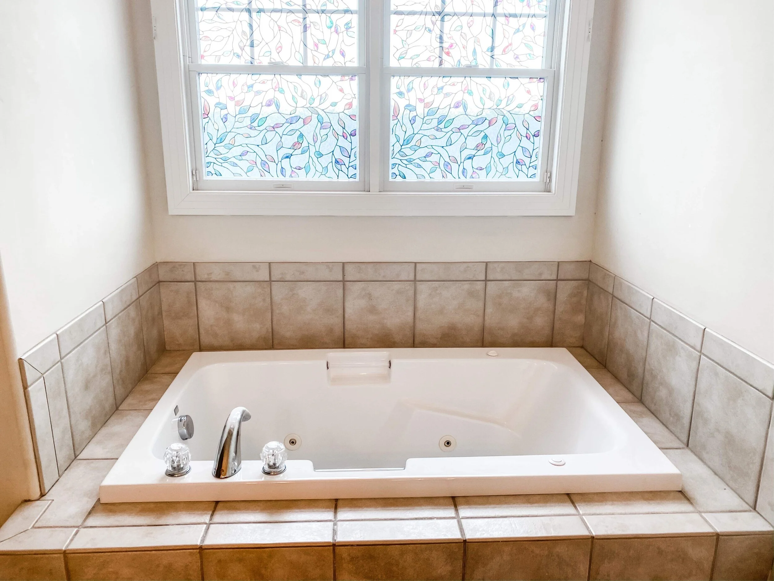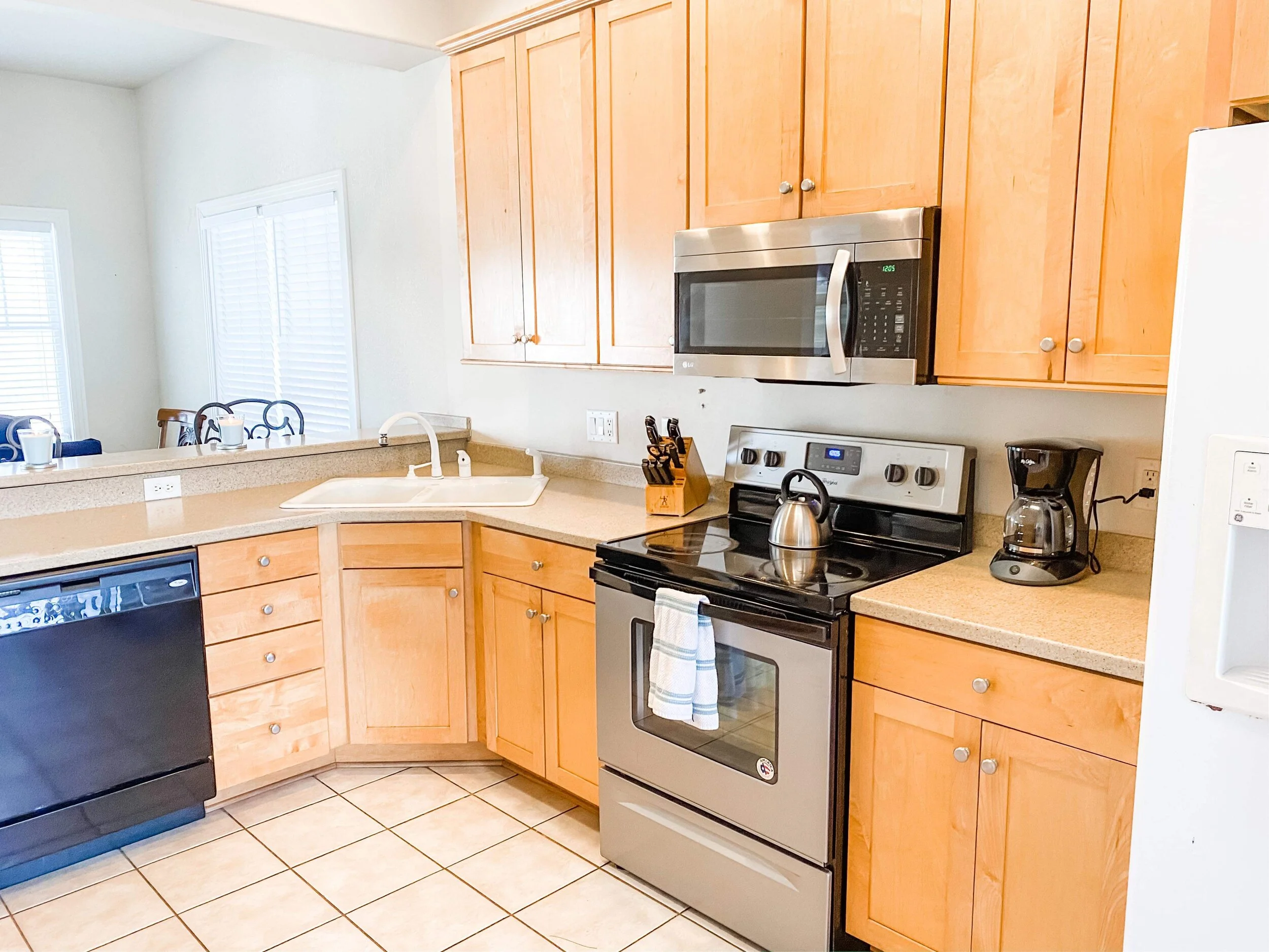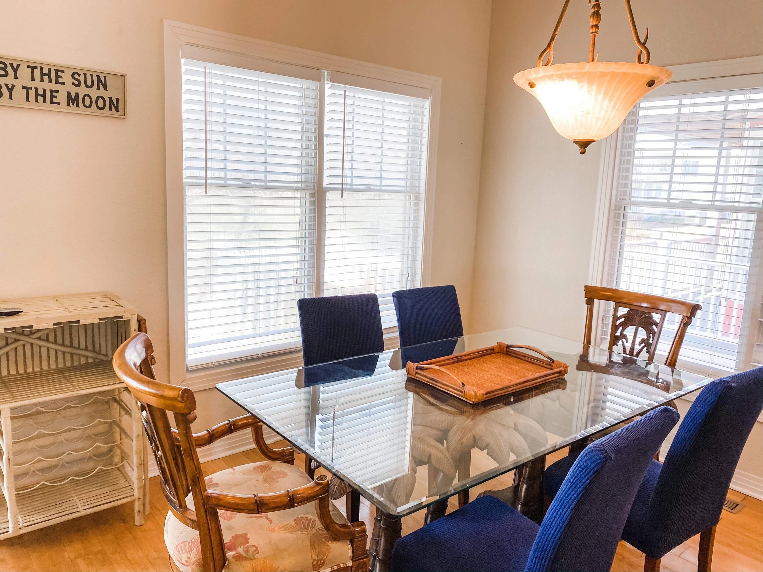The foyer welcomes guest into the open concept home with a roomy eat-in kitchen with all the cooking supplies you’ll need including pots, pans, a Keurig and regular coffee maker, standing mixer, electric griddle, waffle iron, toaster, blender, dishes and glasses. We also have a high chair for our tiniest guests. The comfortable dining and living room areas open up to an expansive back deck that lines the entire back of the home which backs to trees for privacy. The dining table and bar with stools features plenty of space for sharing meals together. The living space includes a fire place, comfortable sofas, chairs, and a television with cable TV. The space is light and airy in its beachy theme making guests feel like they are on the beach throughout their stay.