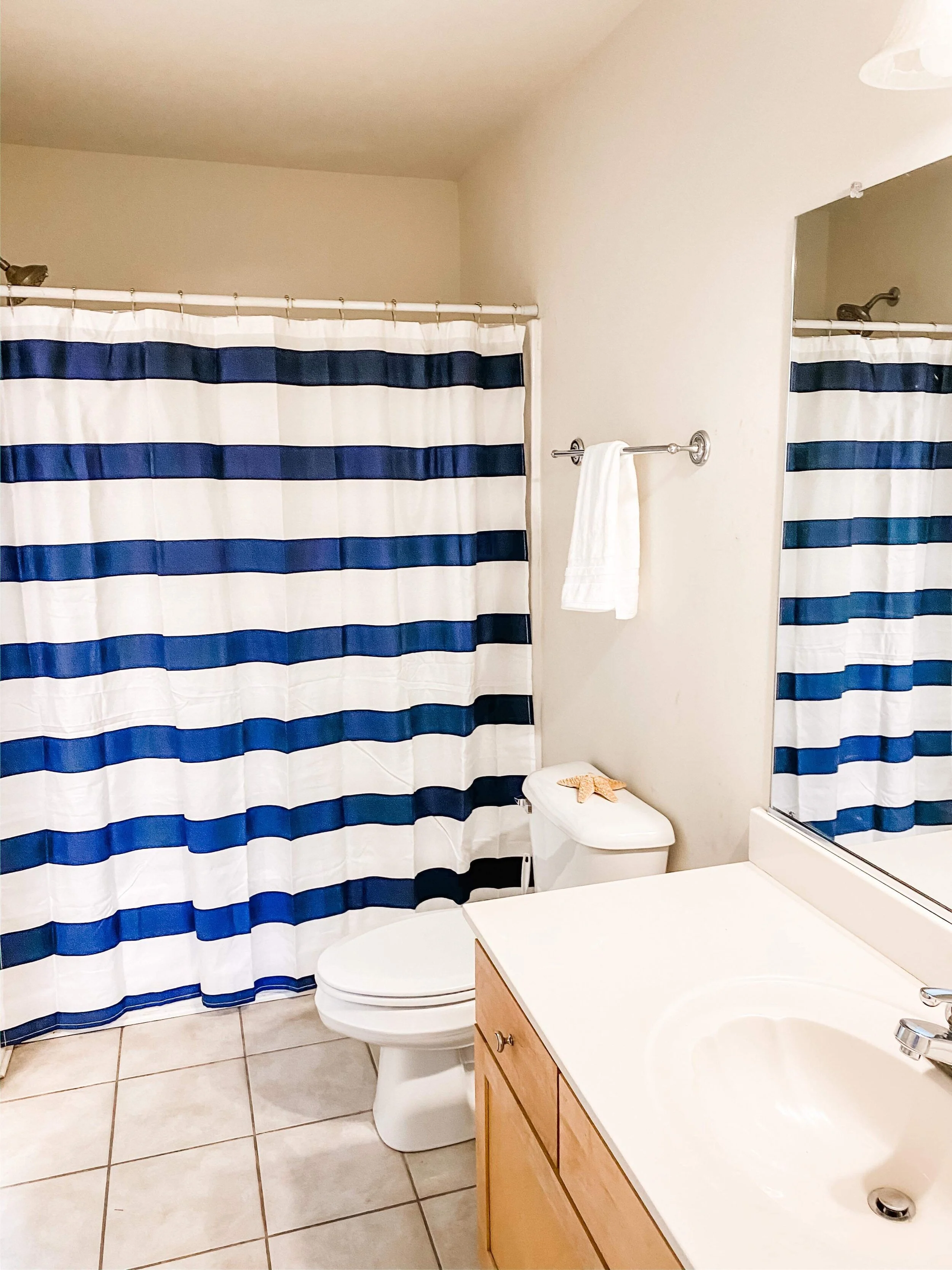 The second level is outfitted with three spacious bedrooms. The second-floor master has a queen size bed, dresser and an attached bath perfect for two couples or multi-generational families. The fun beachy vibe creates a cozy feel. The third bedroom is a child’s dream with two twin beds (4 singles) that features a large sliding glass door to a private screened in porch, overlooking the private backyard.
